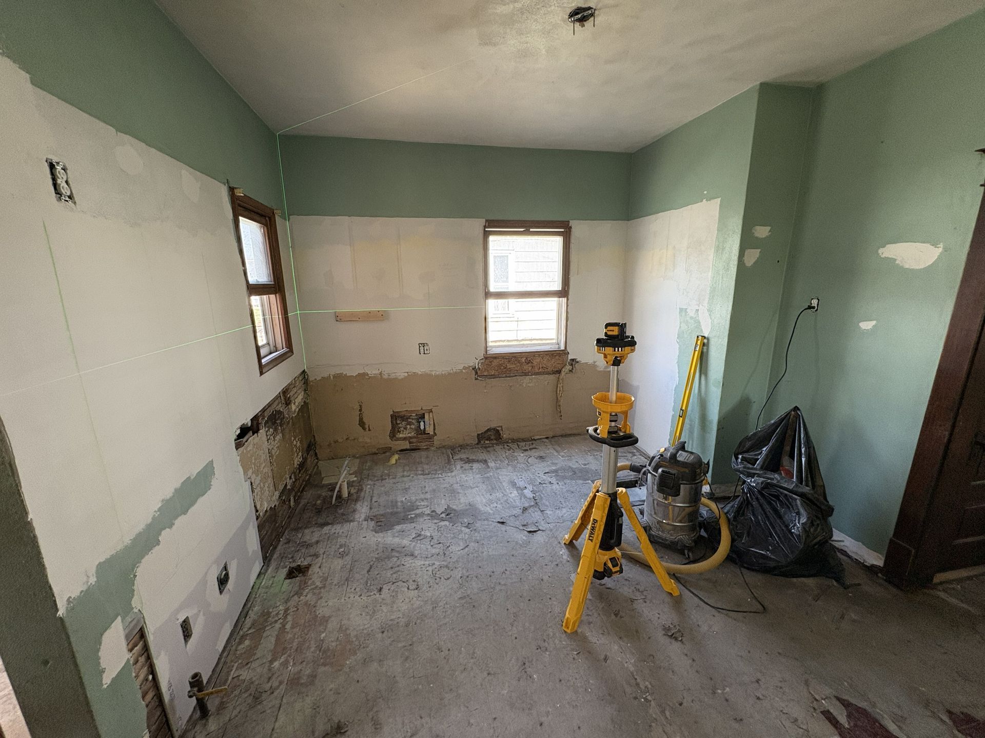 This project began with a full house clear out of trash and furniture left behind by the previous owners, even going as far as removing all of the kitchen cabinets that had fallen to disrepair. The next step, I did prep work to prepare for the other trade workers that were coming in to do some work. There were a couple places where I had to remove large sections of the plaster to allow access for the electricians to route new wires for lights and clear out space for the plumbers to replace a broken shower drain in the second-floor bathroom. While they worked, I installed all new light fixtures, switches, and outlets all throughout the house. Following behind these companies, I got to begin building up! This began with repairing all of the walls that either had previous damage, or I had cut holes into. Once the walls were ready, I began with installing the new kitchen cabinets and flooring. The rest of the house was getting the hard wood floors restored but the flooring didn't continue into the kitchen and bathroom, so we decided to go with high quality luxury vinyl tiles for a classy and resilient floor in a busy area. Next steps came paint prep, taping off flooring and windows throughout the house. The upstairs had painted trim, so I opted to use my paint sprayer to give a nice consistent coating of fresh paint. The rest of the walls I opted for hand painting to give nice sharp cut in lines.